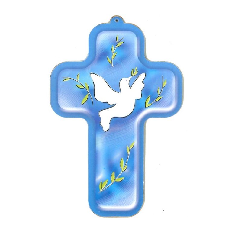 Een vrolijk kruisbeeld met een blauwe duif die licht en rust brengt in de ruimte. Het kleine formaat maakt het geschikt voor bij de wieg of als attent kraamcadeau. De kleuren en afbeelding zijn uitnodigend zonder zwaar religieus te zijn, ideaal voor jonge gezinnen. Een klein symbool van vrede en zorg in huis.